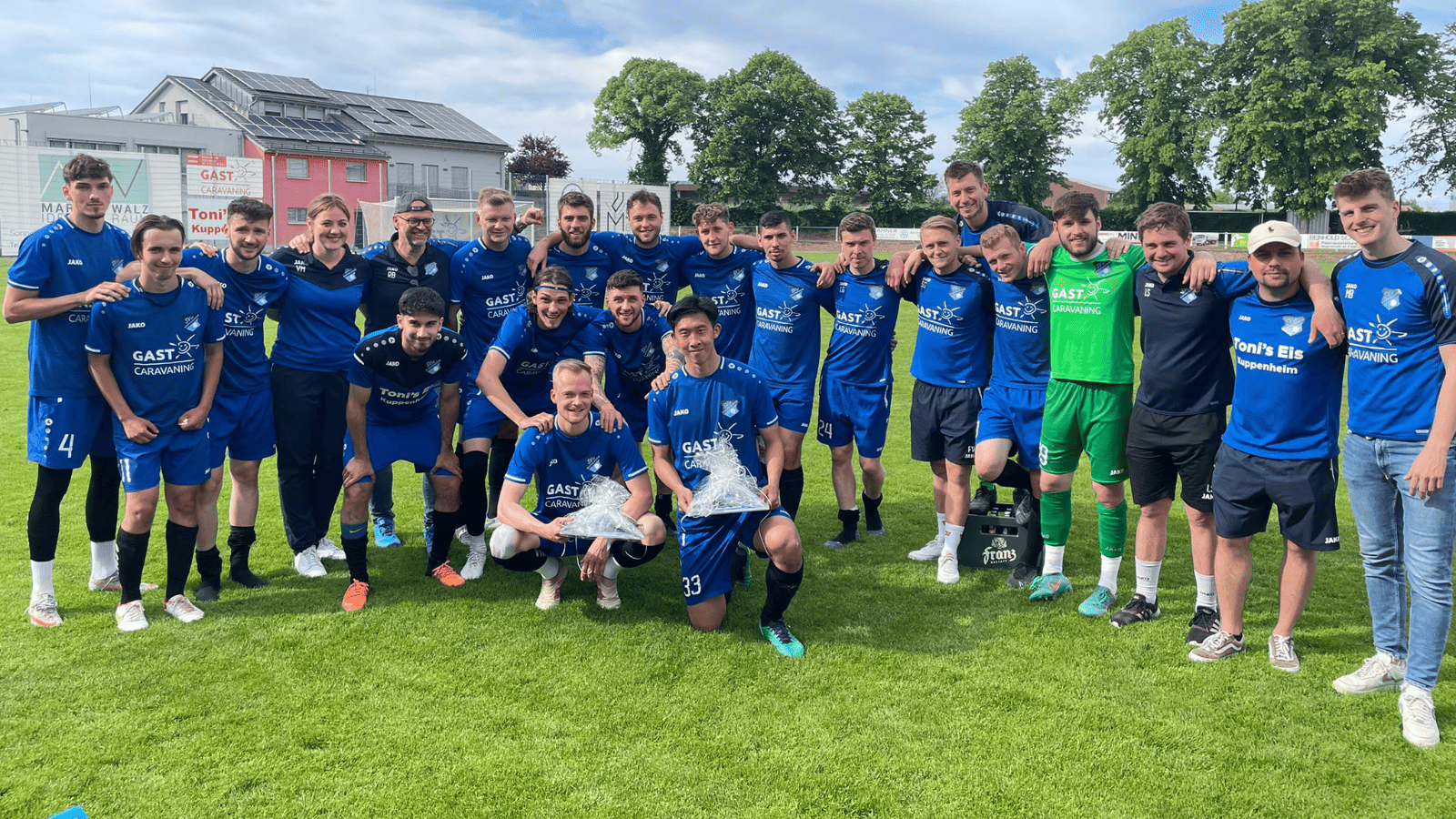 SA | 28.05.2022 | 15:30 1 : 2 Kuppenheim krönt starke Rückrunde 2:1 in Pfullendorf Quelle: BT Mit ein paar Bier begossen Spieler und Betreuer des Fußball-Verbandsligisten SV 08 Kuppenheim noch auf dem Rasen der Geberit-Arena ihren 2:1-Sieg beim SC