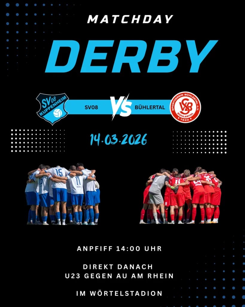 Terminkalender zücken, es ist wieder Derby-Zeit! Diesen Samstag (14. März, 14:00 Uhr) rollt der Ball im Wörtelstadion, wenn unser SV 08 Kuppenheim den SV Bühlertal zum Lokalduell empfängt.